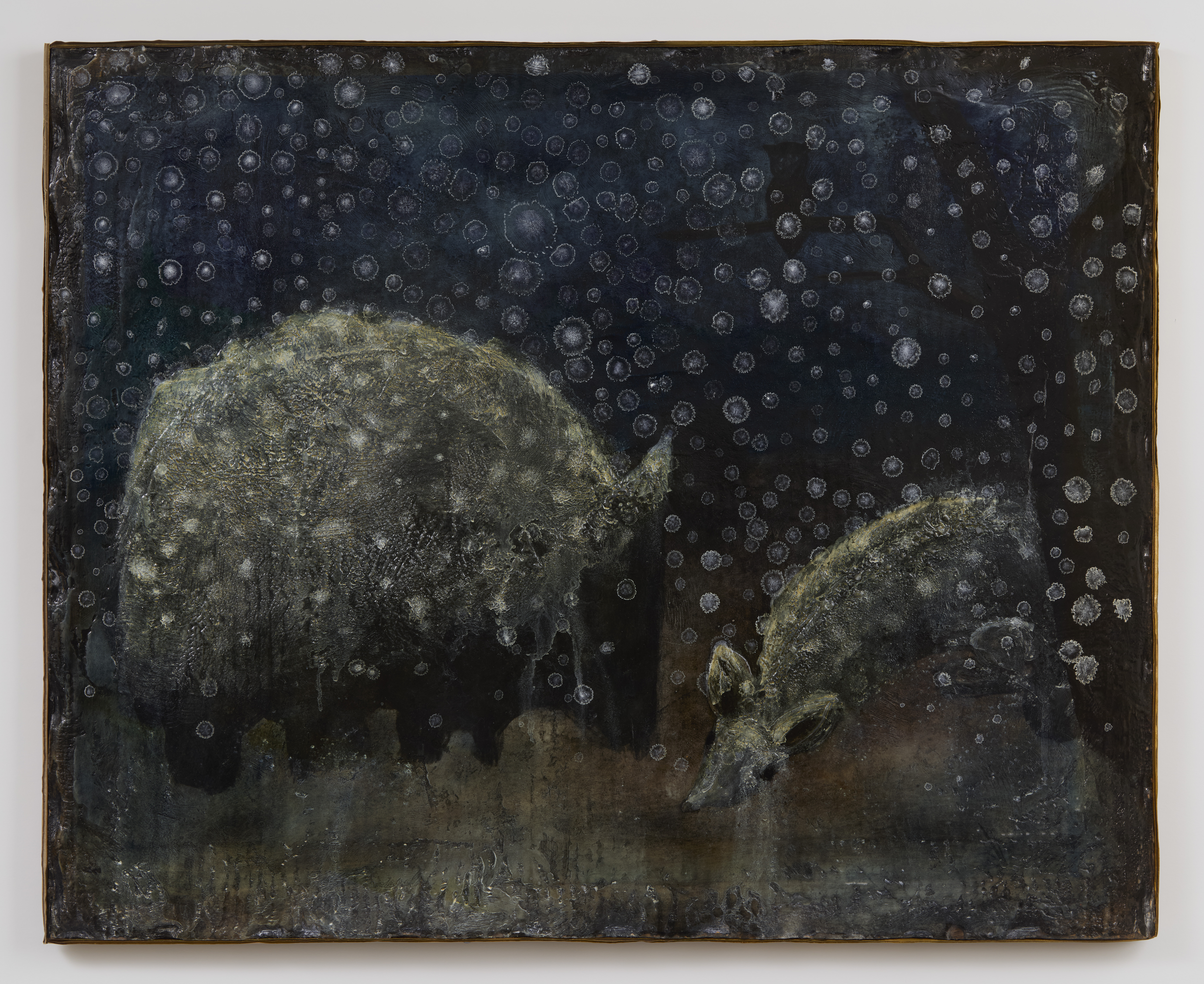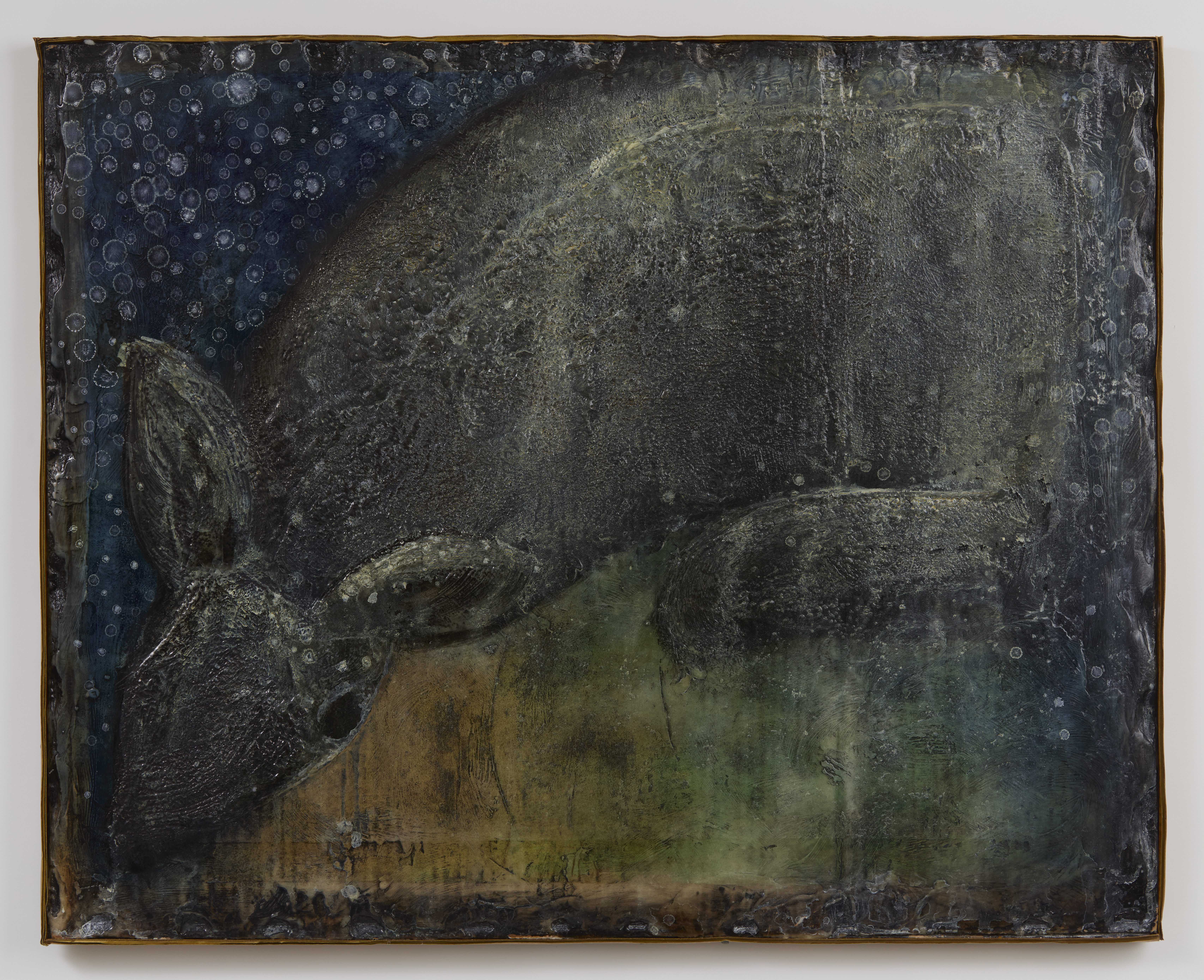 Barnett’s experiences with nature inform the Critters images. The paintings stand on their own yet are also part of a joint project combining art and theater. The accompanying play, written by his husband Eric Lane, follows a community of strong female animals navigating the joys and dangers of life in the woods. A cast of six diverse female actors includes bears, deer, an owl, a stinkpot turtle and a seductive fox. It is theatrical and avoids a literal approach.